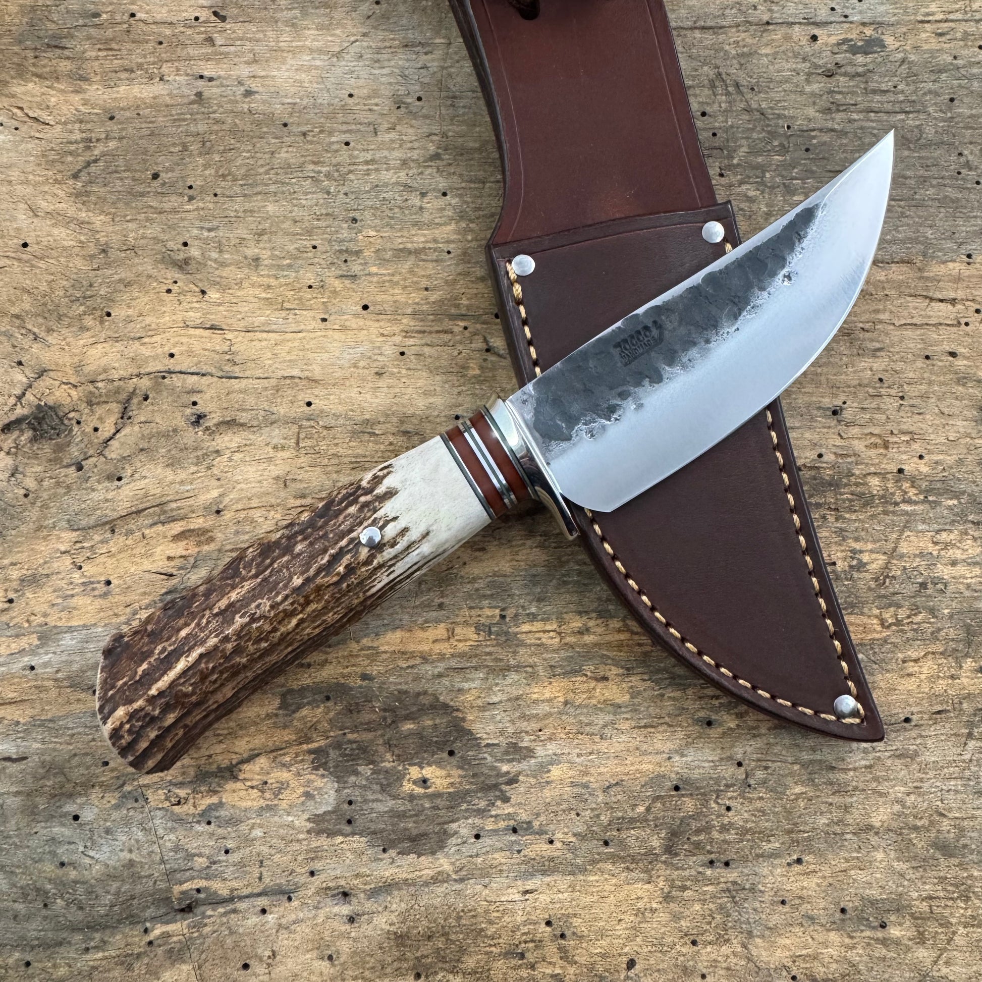 This Hammer Mark Fox river hunter has a 4.5" long, razor sharp hollow ground blade, hand forged from high carbon 1095 and is about .165" thick. The nickel silver guard is silver soldered above a stack of black,, grey, aluminum and butterscotch paper spacers. The premium sambar stag handle is pinned through the tang with a nickel silver pin. OAL is about 9.25" Comes in a dark brown belt sheath