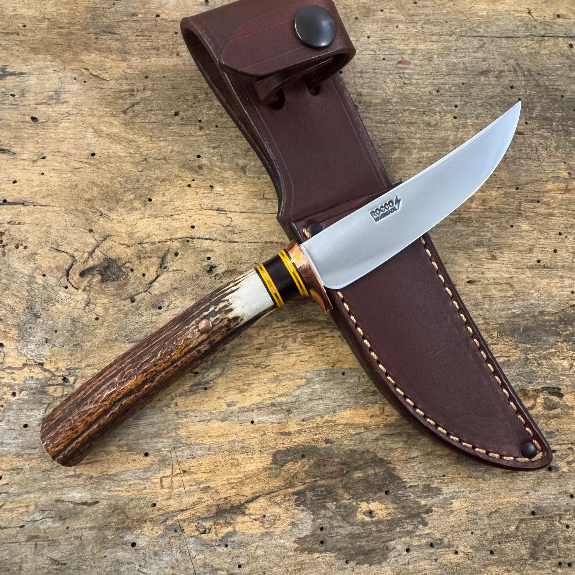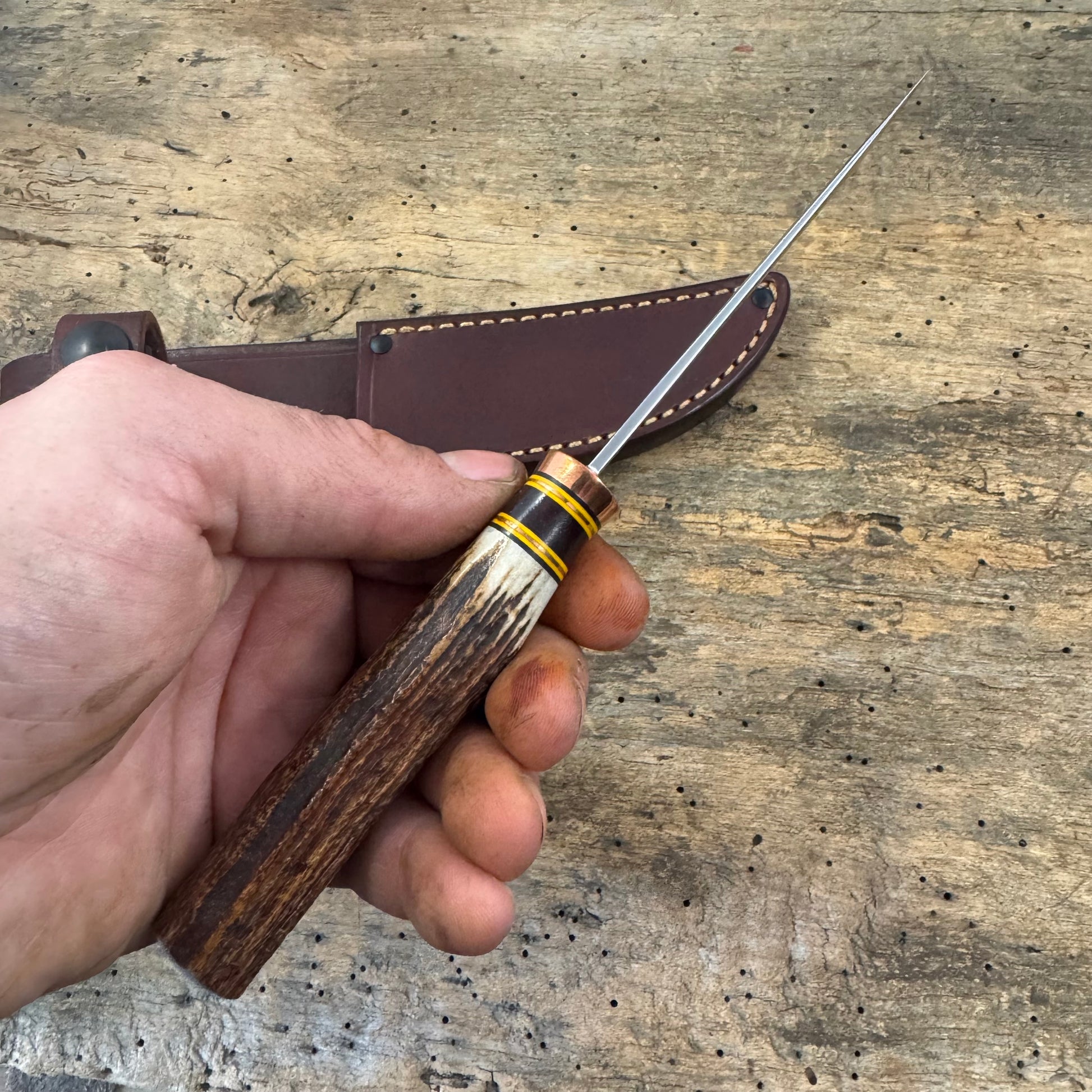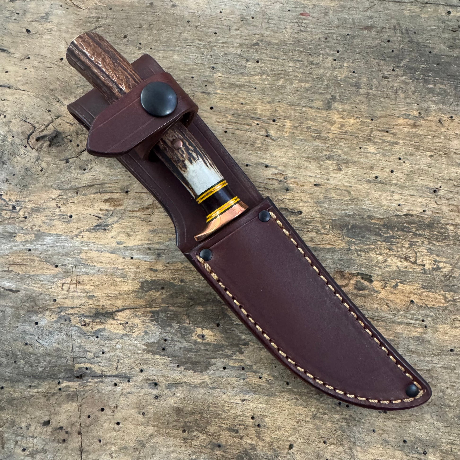 This XL Michigan trout has about a 4" long, razor sharp convex ground blade, hand forged from high carbon 1095 and is about .099" thick. The copper guard is silver soldered above a stack of black, tan, burgundy linen and copper spacers. The premium sambar stag handle is pinned through the tang with a copper pin, OAL is about 8" Comes in a dark brown belt sheath.