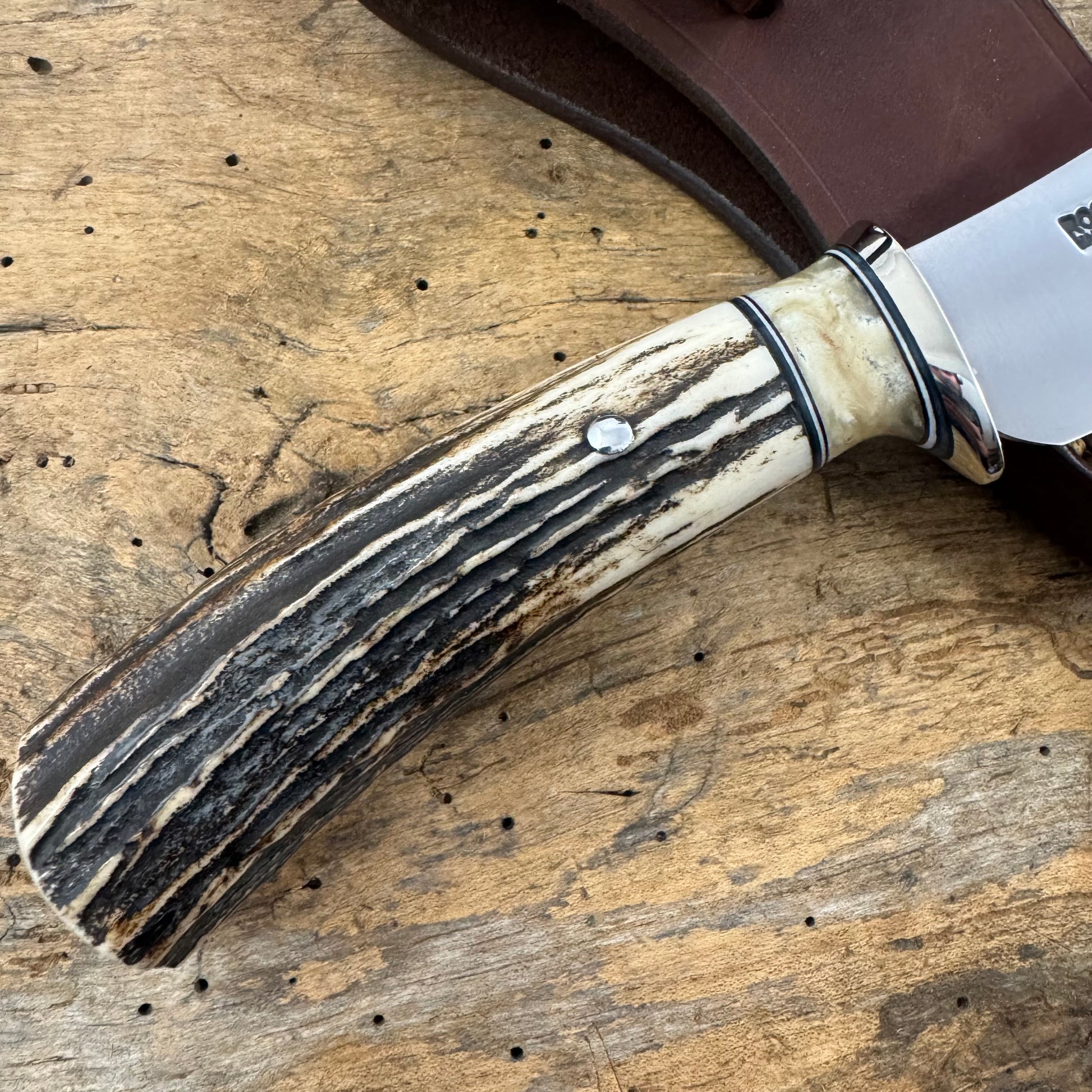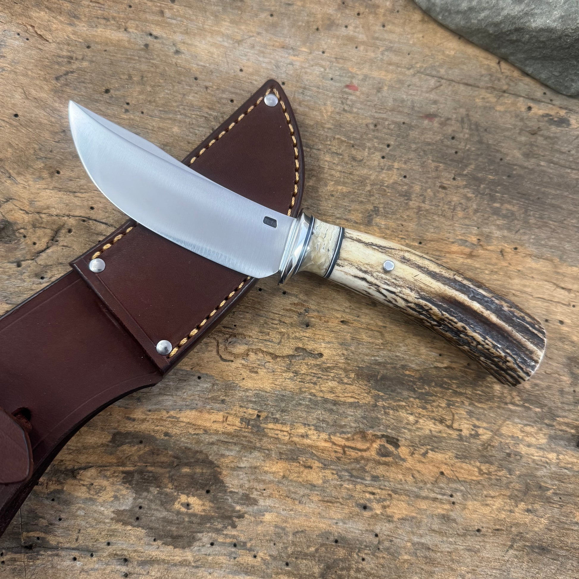 This classic woodcraft pattern blade has a 3.75" long, razor sharp convex ground blade, hand forged from high carbon 1095 and is about .158" thick. The nickel silver guard is silver soldered above a stack of black, dark blue, white and musk ox boss spacers. The sambar stag carver handle is pinned through the tang with a nickel silver pin. OAL is about 8" Comes in a dark brown belt sheath.